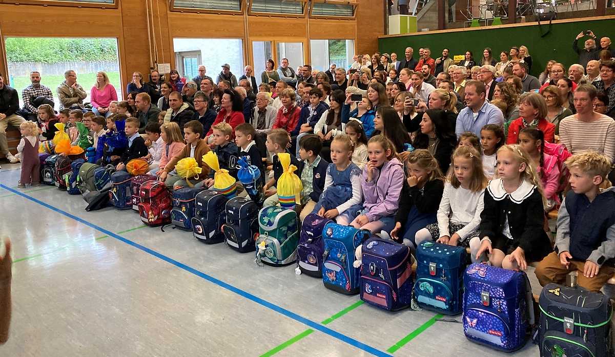 Aufgrund der schlechten Wetterprognose musste die Feier in die Schulturnhalle verlegt werden und fand diesmal nach Klassen getrennt statt. Aufgeregt und stolz präsentierten unsere Erstklässler ihre Schultüten und erlebten ihre allererste Schulstunde.