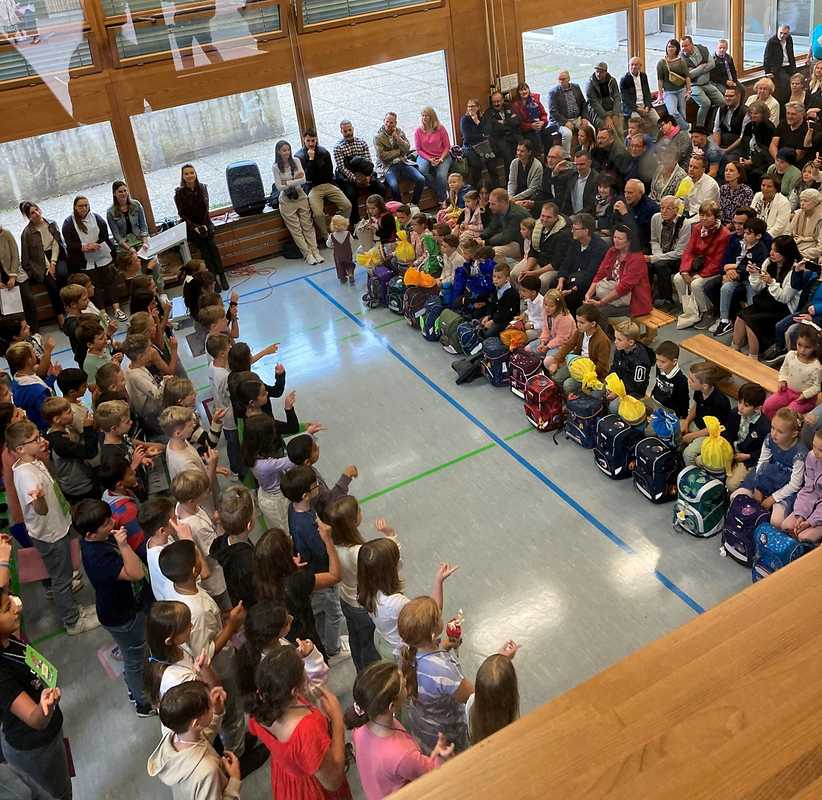 Am daraufolgenden Mittwoch, den 11. September 2024, folgte die Einschulungsfeier unserer neuen Erstklässler. Die 74 Schülerinnen und Schüler verteilen sich auf drei Klassen und wurden mit ihren Familien von Herrn de Wit, den Klassenlehrerinnen, Frau Czopiak, Frau Merkle und Frau Heger sowie unserem Förderverein willkommen geheißen. Unterstützt wurden sie von den Paten der 4. Klassen, die unsere Jüngsten in den kommenden Wochen begleiten werden.