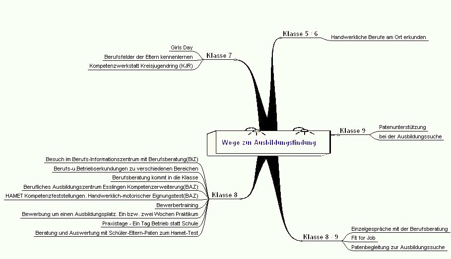 Im 1. Halbjahr informiert das Berufsinformationszentrum über die Vielfalt der Berufe, die für Hauptschüler und Realschüler erlernbar sind. In Kooperation mit Berufsberatung, dem Berufsausbildungszentrum Esslingen, der EnBW Region Stuttgart und OiB-Lehrern sucht der Schüler Antworten auf die Fragen:
